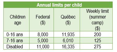 Let us recall that these are cumulative limits. For example, a family with two children aged 6 or under and a child aged 7 to 16 is entitled in Québec to an overall limit of $21,000 for all the children calculated on 2 x $8,000 + 1 x $5,000 ($29,880 for Quebec). This means that if the childcare expenses for a child are less than his maximum limit, the unused portion can be used for the other children whose child’s care expenses exceeds their limits.