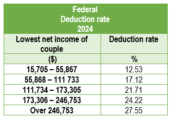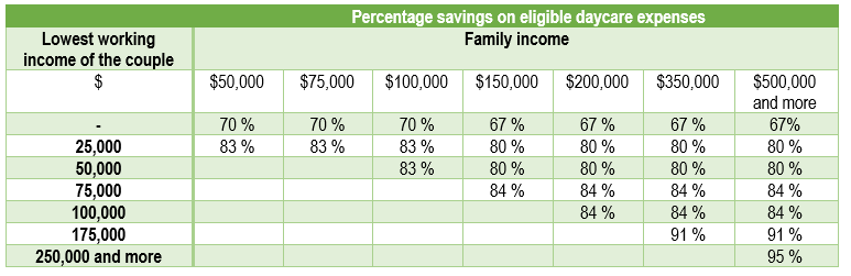 The table at the bottom of this page shows the percentage of tax savings (federal and Québec) on the portion of eligible childcare expenses according to family income and to the work income of the spouse with the lowest income.