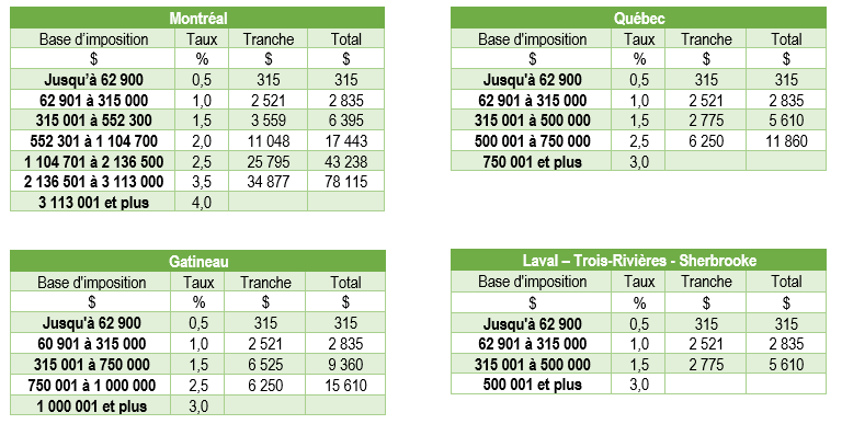 Pour les tranches d’imposition supérieures à 500 000 $, les municipalités peuvent déterminer leur propre taux de taxation généralement jusqu’à un maximum de 3%.