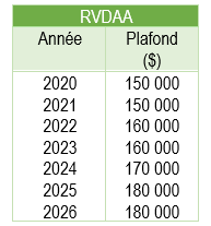 Le plafond de 180 000 $ est indexé par tranche de 10 000 $ selon l’indice de prix à la consommation. Depuis son introduction en 2020, le plafond a augmenté de la façon suivante :