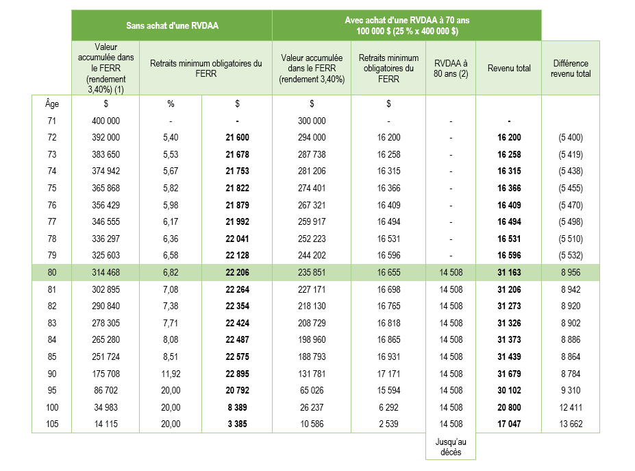 - Achat à 70 ans d’une rente viagère différée de 100 000 $ soit 25% du FERR de 400 000 $