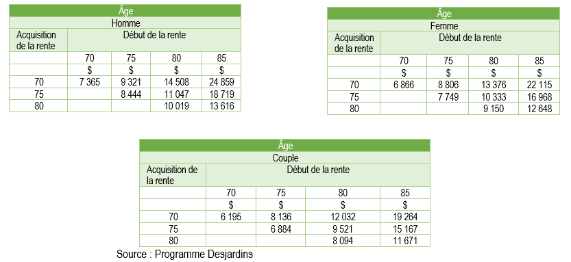 Les tableaux suivants donnent des exemples de rente viagères qui pourraient être acquises avec un capital de 100 000 $.