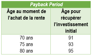 Si l’on suppose que le capital initial ainsi que les rentes versées seraient investis à un taux de rendement de 3,40% (revenus fixes), celui-ci serait récupéré environ entre les âges de 91 à 95 ans selon l’âge où on a acheté la rente.