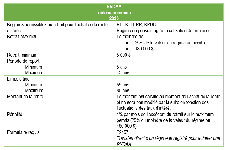 Il est à noter que l’achat de la rente viagère différée peut aussi être effectué par le retrait d’un Régime de participation aux bénéfices (RPDB) ou d’un Régime de retraite à cotisations déterminées.