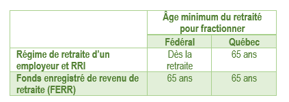 Les retraités qui reçoivent une rente d’un fonds enregistré de revenu de retraite (FERR), d’un régime de retraite d’un employeur ou d’un régime de retraite individuel (RRI) peuvent généralement fractionner leur rente avec leur conjoint sur leur déclaration d’impôt à partir de l’âge de 65 ans. Au fédéral, la rente de retraite d’un régime d’employeur ou d’un RRI peut être fractionnée avant l’âge de 65 ans soit dès le début du versement de la rente.