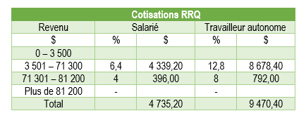 Comme on peut le constater, les cotisations d’un travailleur autonome (maximum 9 470 $) sont nettement supérieures à celles d’un employé (maximum 4 735 $) soit le double. Il est à noter que dans le cas d’un employé, c’est l’employeur qui paie l’autre moitié (maximum 4 735 $).