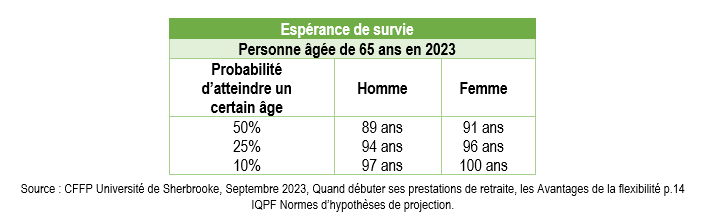Reporter le début de la rente permet d’assurer le risque de survie i.e de bénéficier d’un revenu stable si on a la chance de vivre jusqu’à un âge avancé. À titre de guide, le tableau qui suit donne la probabilité qu’une femme ou un homme de 65 ans en 2023 atteigne un certain âge. Par exemple, un homme de 65 ans en 2023 à 25% de chance d’atteindre 94 ans.