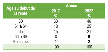 Malgré l’augmentation de la bonification récente du report de la rente après l’âge de 65 ans à 8,4% par année, on constate que seulement 8% (6% + 2%) des retraités avaient choisi de reporter leur rente après 65 ans en 2022. Cette proportion est cependant en croissance par rapport à 2017 seulement 4% (3% + 1%) des retraités ont reporté le début de leur rente après l’âge 65 ans.