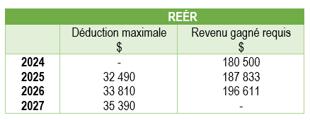 La déduction maximale pour 2025 est de 32 490 $. Elle est calculée en fonction de 18% du revenu gagné l’année précédente.